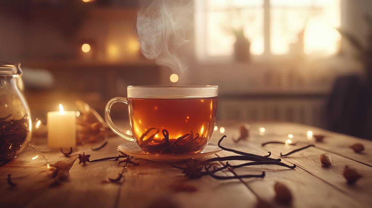 L'association du rooibos avec la vanille crée une symphonie gustative particulièrement réconfortante. Les notes de vanille Bourbon apportent une dimension gourmande qui sublime la douceur naturelle du rooibos rouge. Certaines compositions incorporent également la fève de tonka, ajoutant une touche aromatique subtile et sophistiquée. Cette harmonie de saveurs transforme chaque tasse en une véritable expérience sensorielle, capable d'éveiller les papilles tout en procurant une sensation de bien-être immédiat.
